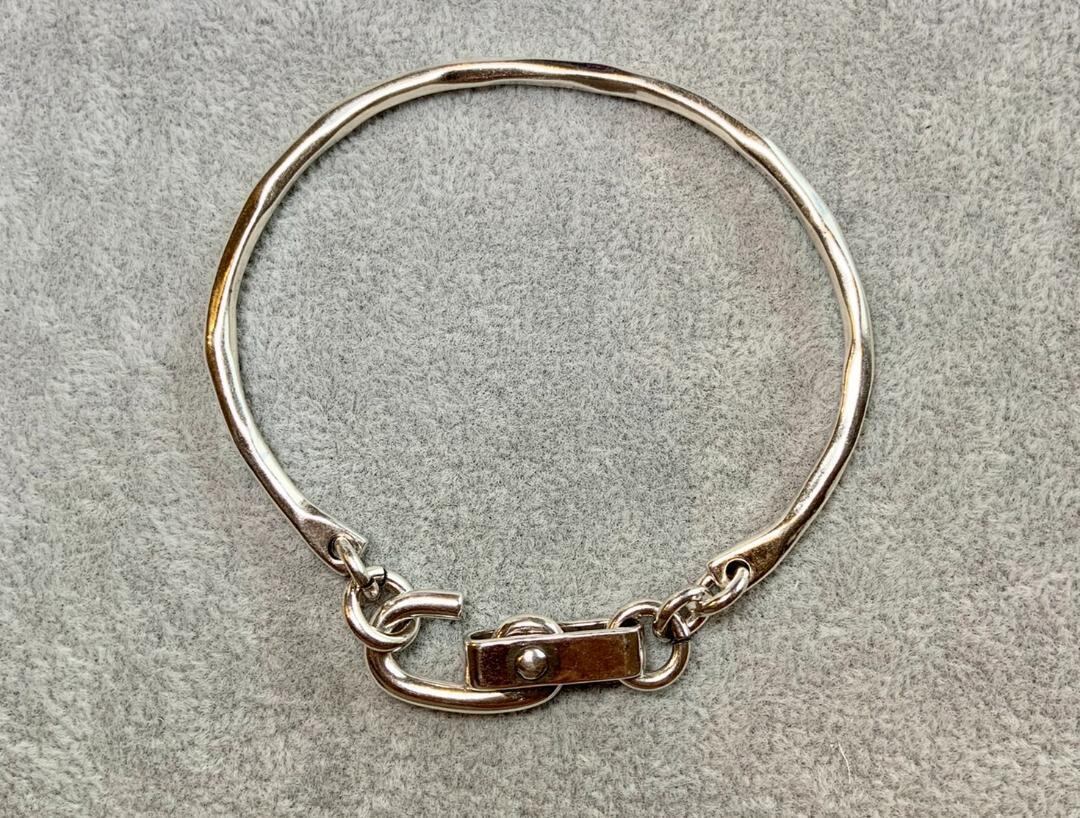 少し大きめの フック と 留め具部が印象的な アンティーク なバングルです。特殊コーティングを施してあり、水や汗にも強く